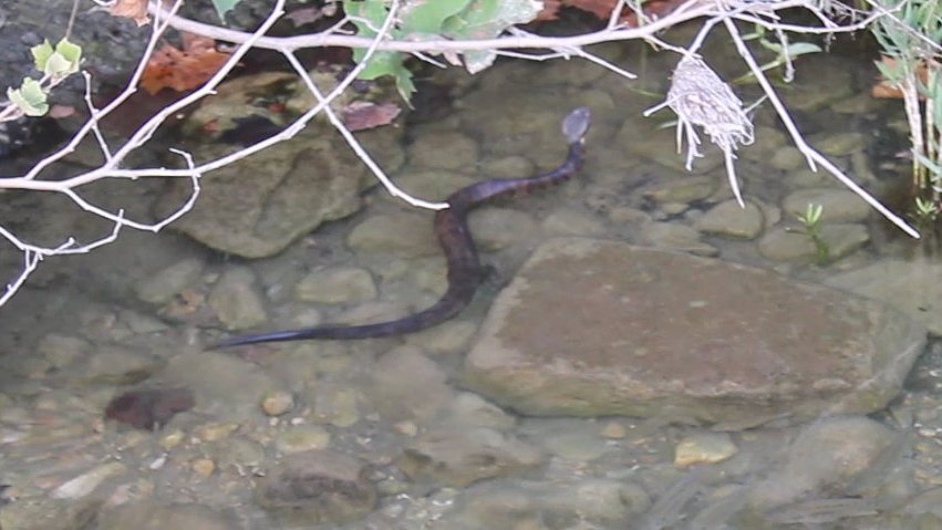 Last evening I stood on the edge of the Creek filming a small pool crowded with young bass and a couple young catfish when a broad-banded water snake swam into my left peripheral vision. Leopard frogs and cricket frogs all over the banks. Bite-size fish all between the banks. No wonder a healthy water snake would retire to the weeds after dinner time.