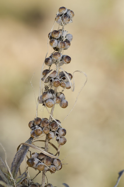 Also known as Roosevelt Weed or New Deal Weed, this Baccharis grows just east of the south end of the Pond and near the sandy bank of the Bluff. It's one of those native plants that looks like a non-native invasive species, quickly adopting any disturbed or otherwise sorry soils that many other plants cannot survive in. Right now it's in bloom, as it often is following late-summer rains. After the Dust Bowl era, it was planted to help revegitate waste areas.