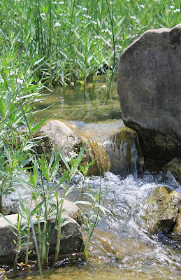 Constant birdsong, summer tanagers unafraid of our presence in their woods, cool rains, smell of distant burning juniper, giant walking sticks preying on others within the orchard trees, and a Creek that changes daily.  Waters are pulled by gravity, ever shifting shapes and humbly re-forming their ways according to the most immediate environments: faultline, hillside, boulder-face, fallen limb, fish scale, strider-leg, or crystal-housed diatom.  The waters' devotion to impermanence is reflected in the effect it has on all else, as well, for the humility of waters is balanced by the unrivaled strength of its substance.