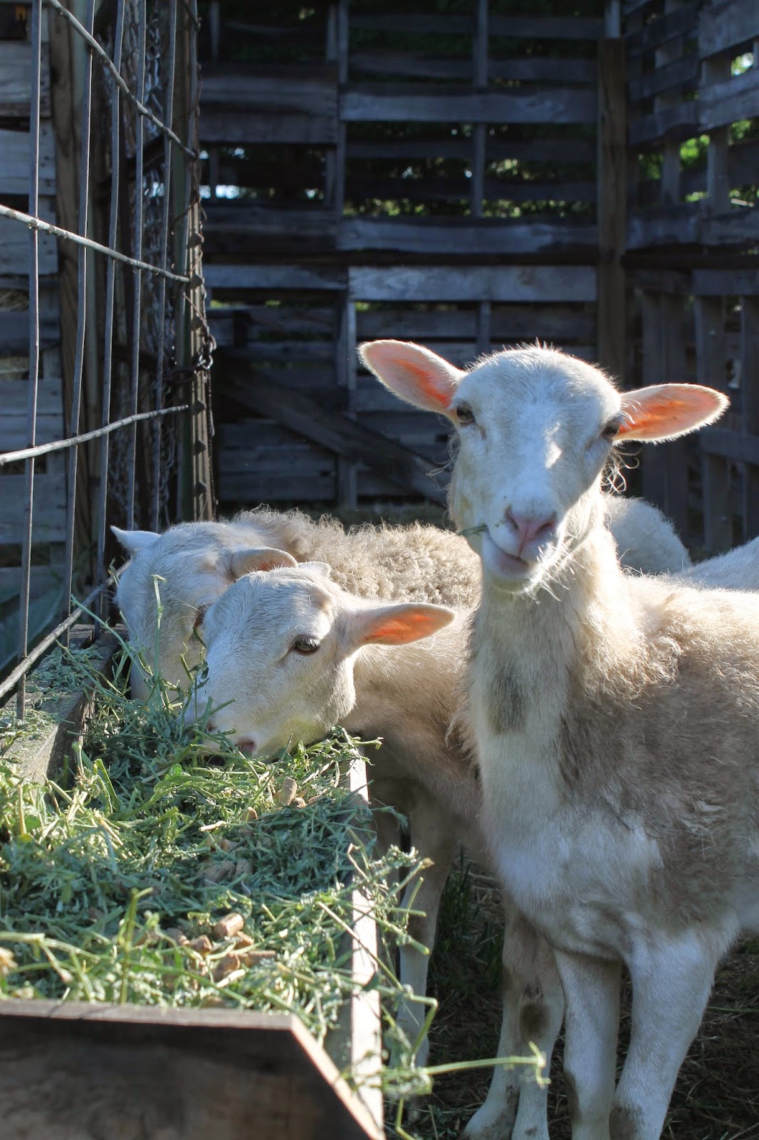 A couple hundred yards up the slope from the Creek the three ewes enjoy alfalfa until a fence is completed for them in the front field.