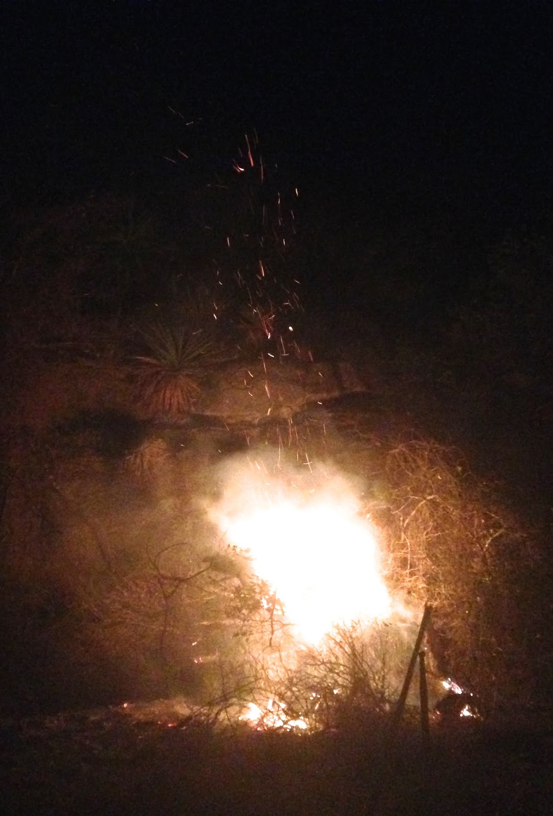 Burn pile flaring up after dark.