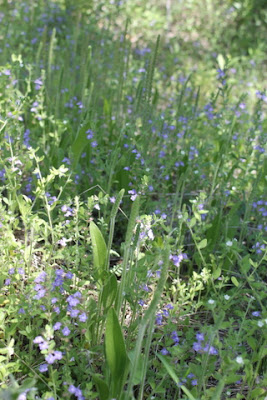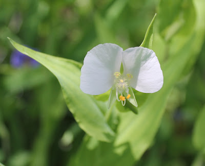 Last year we saw hardly any patches of widow's tears, but this spring they crowd every shady spot there is. The trail leading up Whitman's Rough to Priest's Cave is an overgrown mini-jungle of these sweet blue flowers and their thick-leaved grass-like parts. Occasionally a white flower among them can be found.
