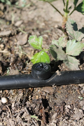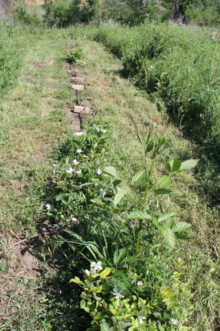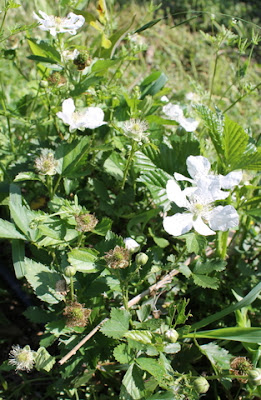 What we see here is an overgrown garden where last year there was barely enough short grass to wither and die in a drought and heatwave. But this year we've already had more rain than the total for last year, so plants grow to waist-high, climbing over, winding around, and nearly hiding the few intentional plants we set out one year ago. The first picture of the little orchard would look different today: I spent the past two days mowing it down and then installing several hundred feet of black irrigation pipe. Now we merely set the timer up at the well and watch water drip out at a rate of one gallon per hour, slowly moistening the sandy soil around blackberries, peaches, apples, pears, plums, and figs. Had we built the irrigation system last year, perhaps we would not have lost three quarters of the blackberry plants. Those few that did survive the record dry heat are now producing green fruits.