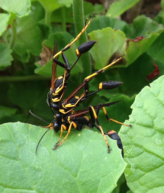Sex among three black and yellow mud daubers (Sceliphron caementarium).