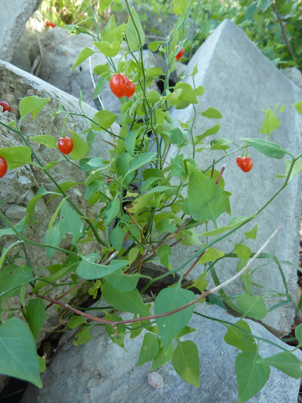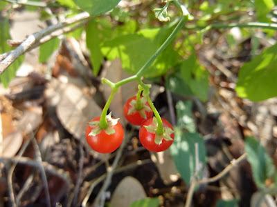 One has to know that this plant and its tiny red fruit do look something like the famous chili pequin that is of the genus Capsicum in the Solanaceae family. This is the famous nightshade family of plants, containing many poisonous plants or plant parts. Potatoes, tomatoes, chilis, etc. I wanted so badly for the fruit to be spicy hot. But when I got the thing in my mouth, I knew instantly it wasn't what I wanted it to be. Spitting and mouth-rinsing perhaps helped, but for several hours thereafter, I began to get hints at why it might be called nightshade. The nausea and dizziness passed, and I was able to enjoy an evening of cold beer and grilled food around a fire and with good friends. Fireflies and creek sounds resumed their lovely act. Now, we could go on about some "lesson" in look-alikes or how we so desperately want something to be what we want it to be and how poisonous this behavior turns out sometimes. But we won't go there.