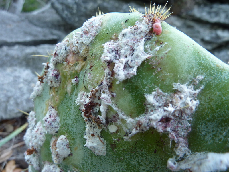 | Cochineal insect (white) thriving on a pad of Opuntia cactus that grows among limestone boulders on Whitman's Rough above Priest Cave |