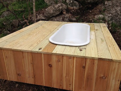 Clawfoot tub nestled in a small deck on a rocky hillside