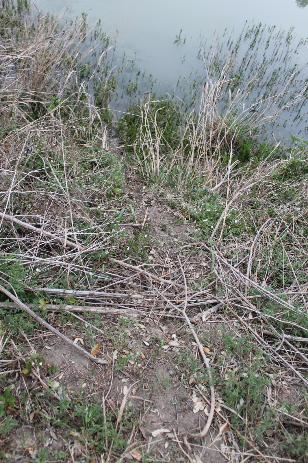| Beaver trail leading out of the Pond, up across the small trail, and to the oaks and cedar cut down. |