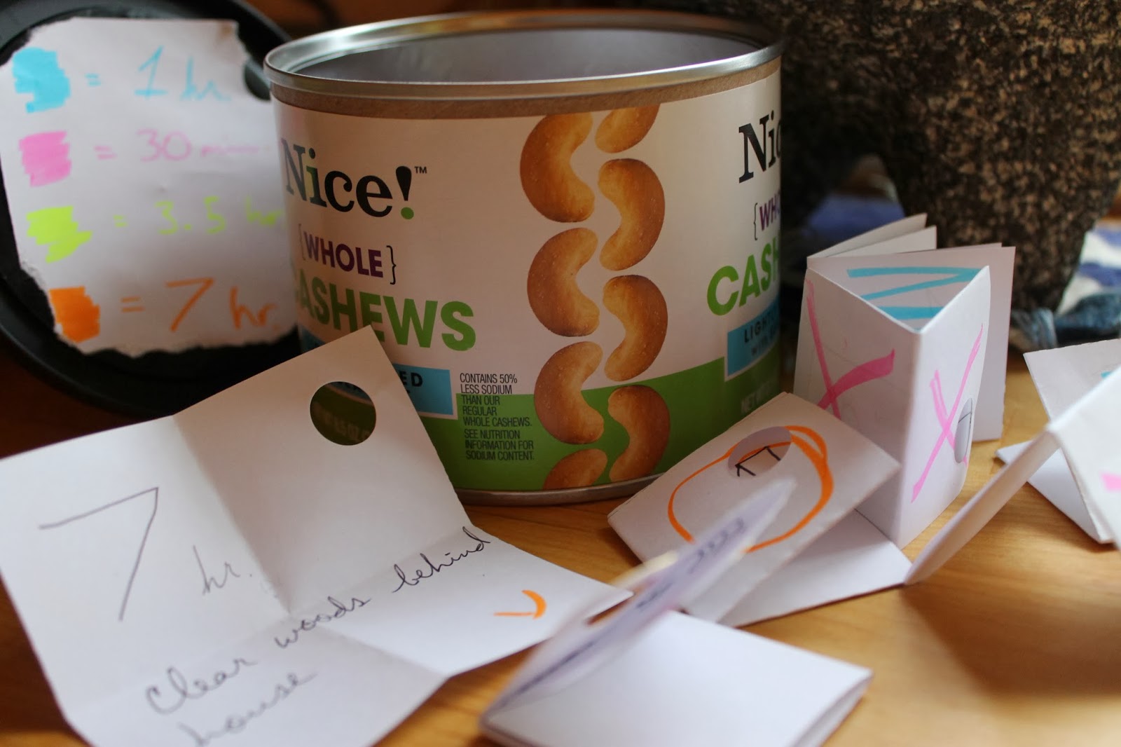 That's when K. suggested that we write on slips of paper the individual projects and label them as "7-hour," "3-hour," and "1-hour" projects. We wad them up and stuff them into an empty cashew jar. Then when I have, say, a full day or most of a weekend's worth of time, I reach into the jar and blindly pull out any one of the 7-hour project sheets and get to work. This process eliminates the paradox-of-choice. I have no choice but the one slip's assignment.