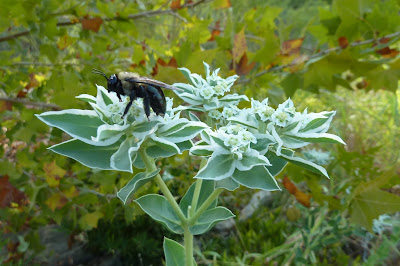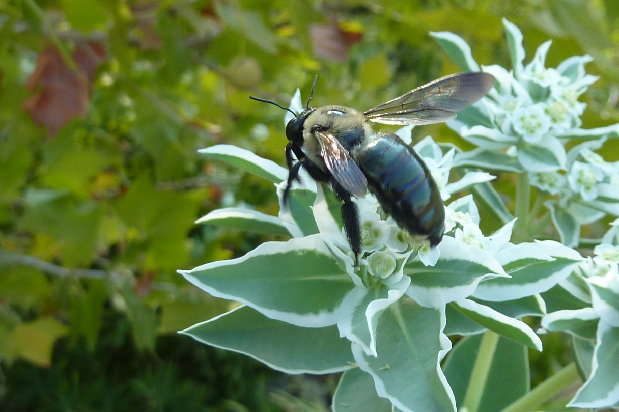 What might be a carpenter bee (Xylocopa) on snow-on-the-mountain (Euphorbia marginata)