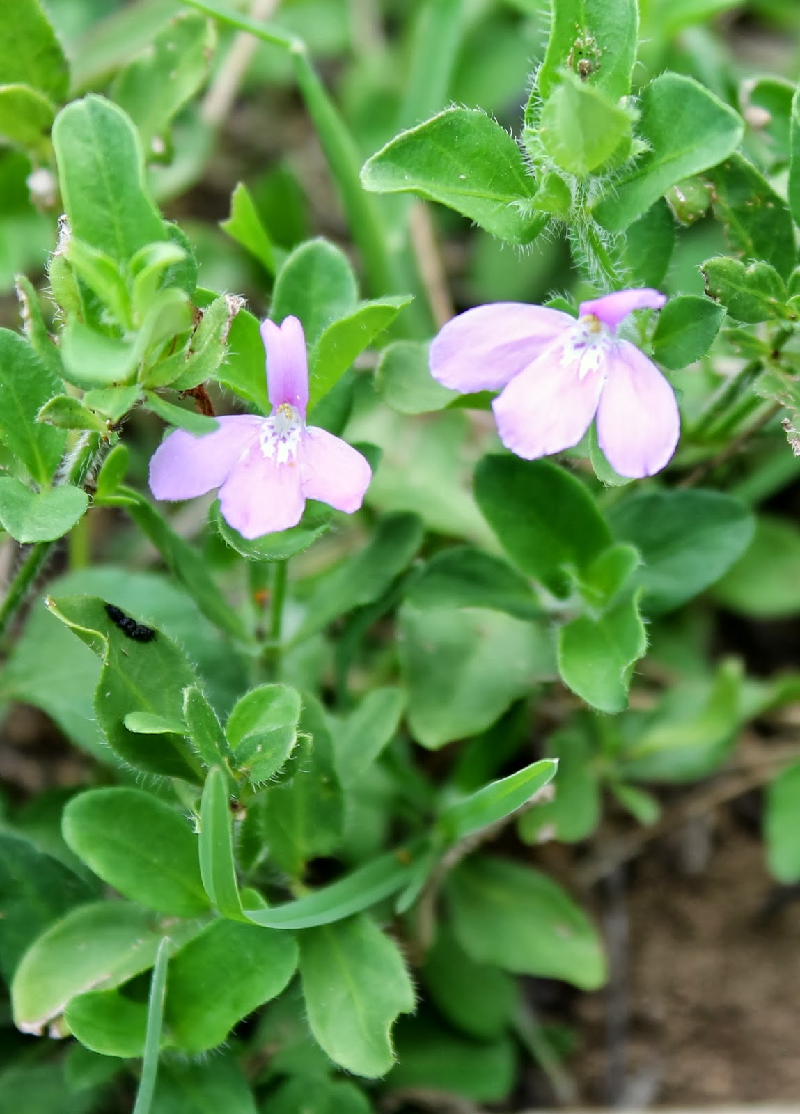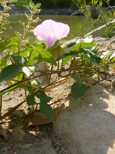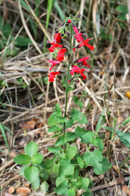 These two [below] are not only more colorful than the last two plants, but they have distinctive characters that rule out a large number of wrong possibilities. These characteristics are not guarantees, but finding something that seems to be rare is an enjoyable experience at the end of the find-a-name puzzle. In the example of the bean family vine Strophostyles, the unusual shape is that thing in the middle of the flower. I have a book about the legumes of Texas and the description for the genus Strophostyles says "keel strongly incurved." My picture looks similar to