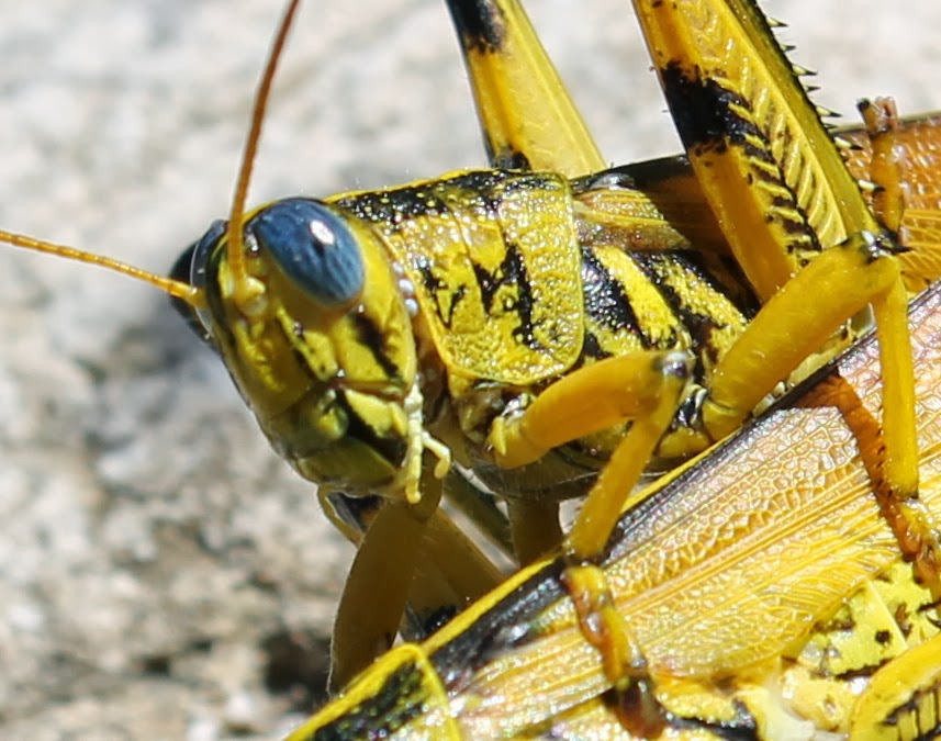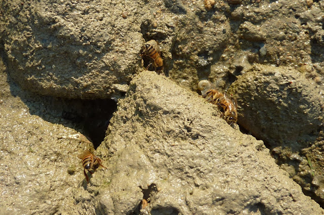 Up along the row of blackberry vines on the unnaturally thriving snow-on-the-mountain plant we've been looking at for several blog posts, I found this beautiful wasp-look-alike insect that may be a robber fly (Lampria bicolor). If you can correct this identification, please let us know.