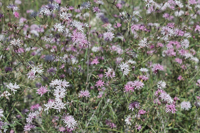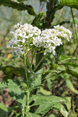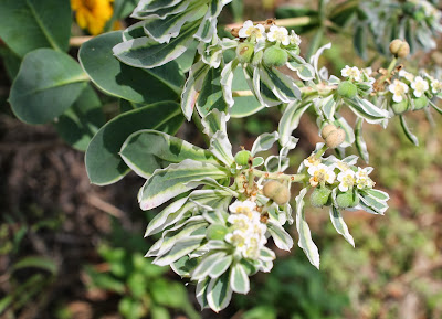 Here is a great comparison photo below. I never knew that snow-on-the-mountain changed the white edges of its leaves and bracts during the period when its flowers are developing. The first photo of two blog entries ago shows the plant as the first flowers were blooming, and the one below displays the full-bloom stage of the leaves. Such a change obviously augments any of the flower's attempts to draw the attention of pollinating insects.